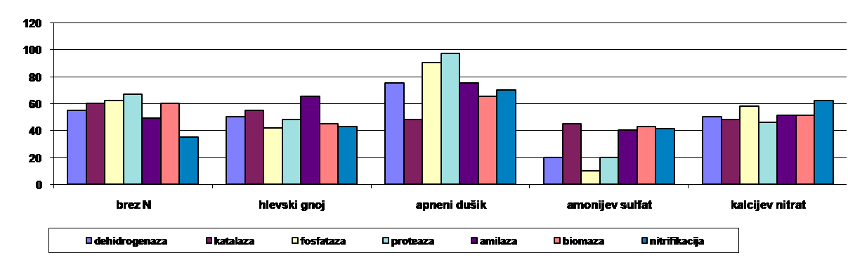 Že raziskave Alison (1924) in Mukeri (1932) dokazujejo, da apneni dušik značilno poveča število mikroorganizmov v tleh. Biološka aktivnost tal, ki je merjena z encimsko aktivnostjo je povečana, če uporabljamo apneni dušik. Poleg rastlin tudi mikroorganizmi v okolje izločajo encime, ki v tleh katalizirajo predvsem koristne in redkeje škodljive kemijske reakcije. Bosch in Amberger (1983) iz Tehnične univerze v Munchnu sta pri ocenjevanju stalnega poskusa, ki je trajal preko 53 let z različnimi dušikovimi gnojili (hlevski gnoj, KAN, apneni dušik, amonijev sulfat, kalcijev nitrat) prišla do rezultatov, kjer so bili parametri rodovitnosti tal na parcelah, ki so jih gnojili z apnenim dušikom največji (slika 3). Poskus je temeljil na merjenju biološke aktivnosti tal (aktivnost sedmih encimov).